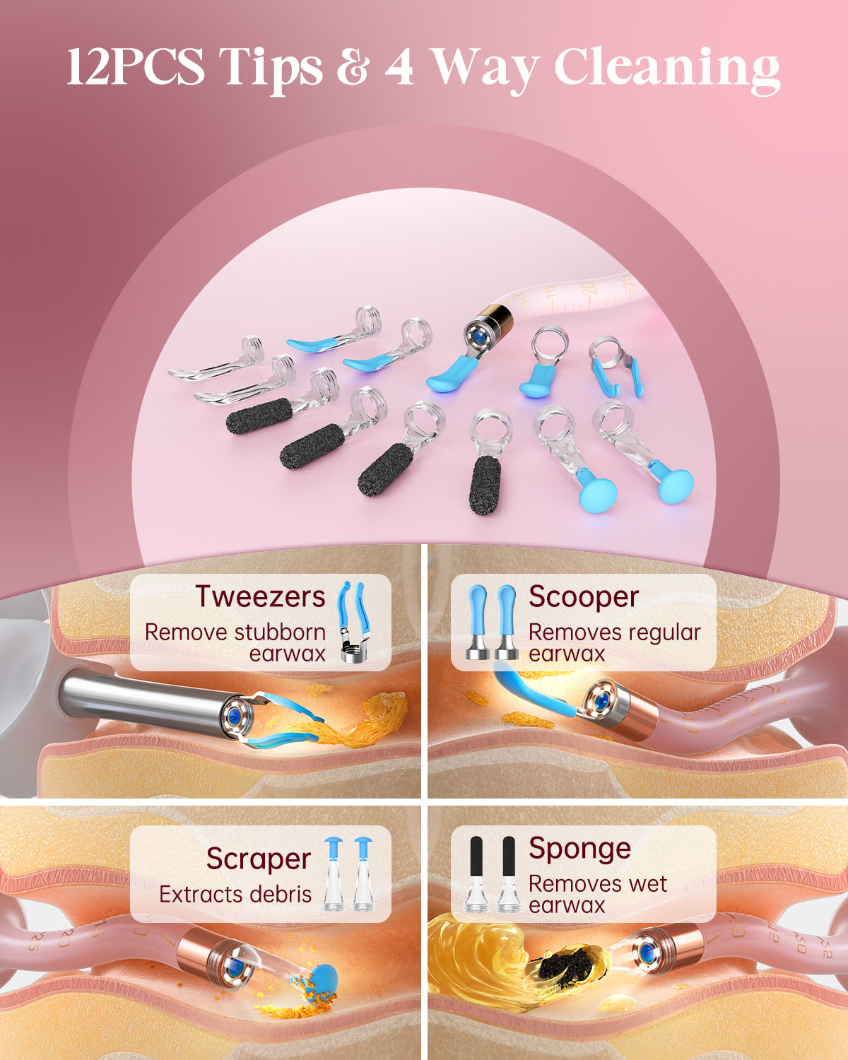 Multiple interchangeable tips provide complete ear care for different needs. Easily switch tools to clean oil, dry skin, and stubborn debris with precision and comfort.