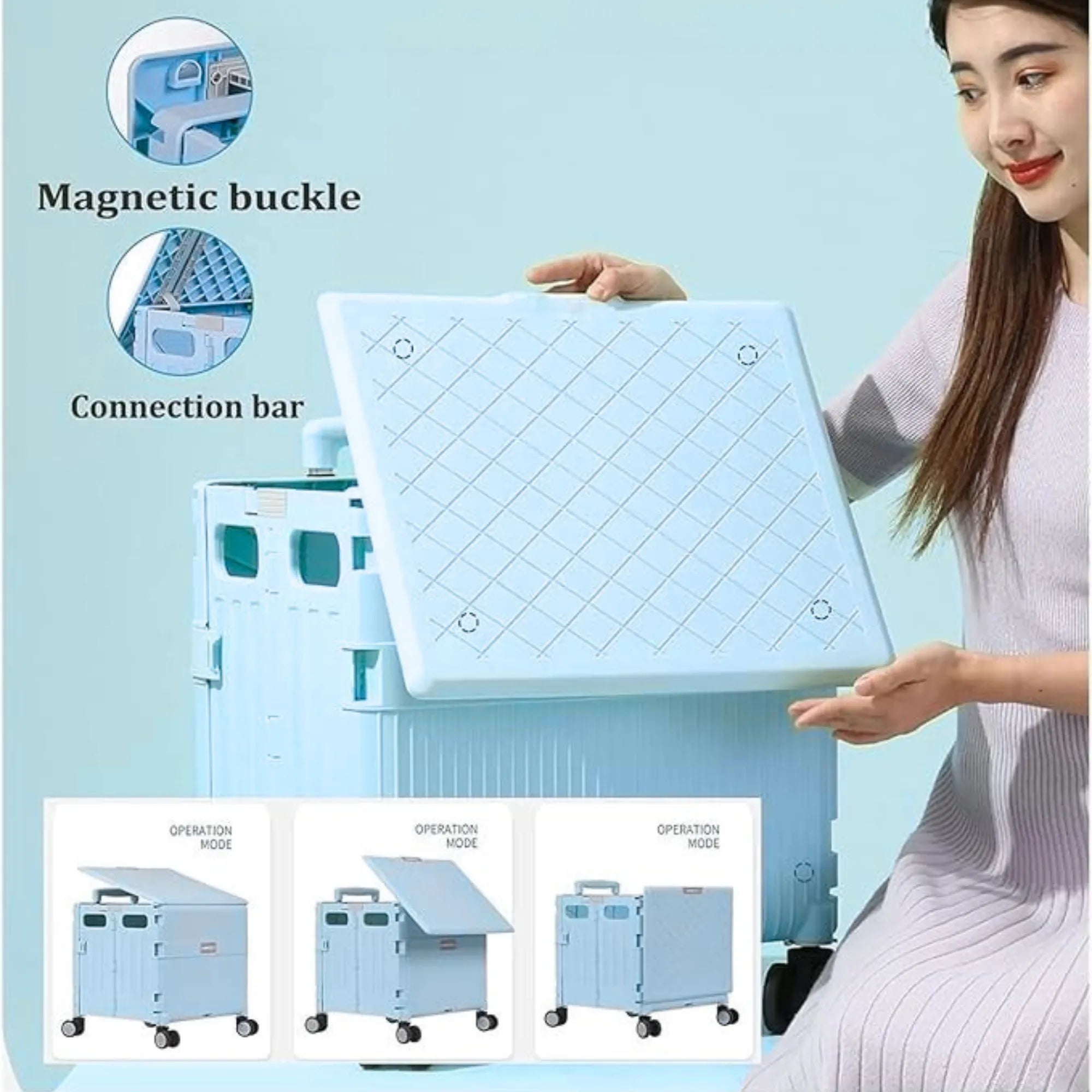 This foldable shopping cart is designed for convenience, durability, and smooth mobility. Made from high-tenacity PP material with an aviation-grade aluminum alloy frame, it offers excellent strength while remaining lightweight and easy to carry. The integrated magnetic lid keeps your items secure, making it ideal for daily shopping and multi-purpose use.