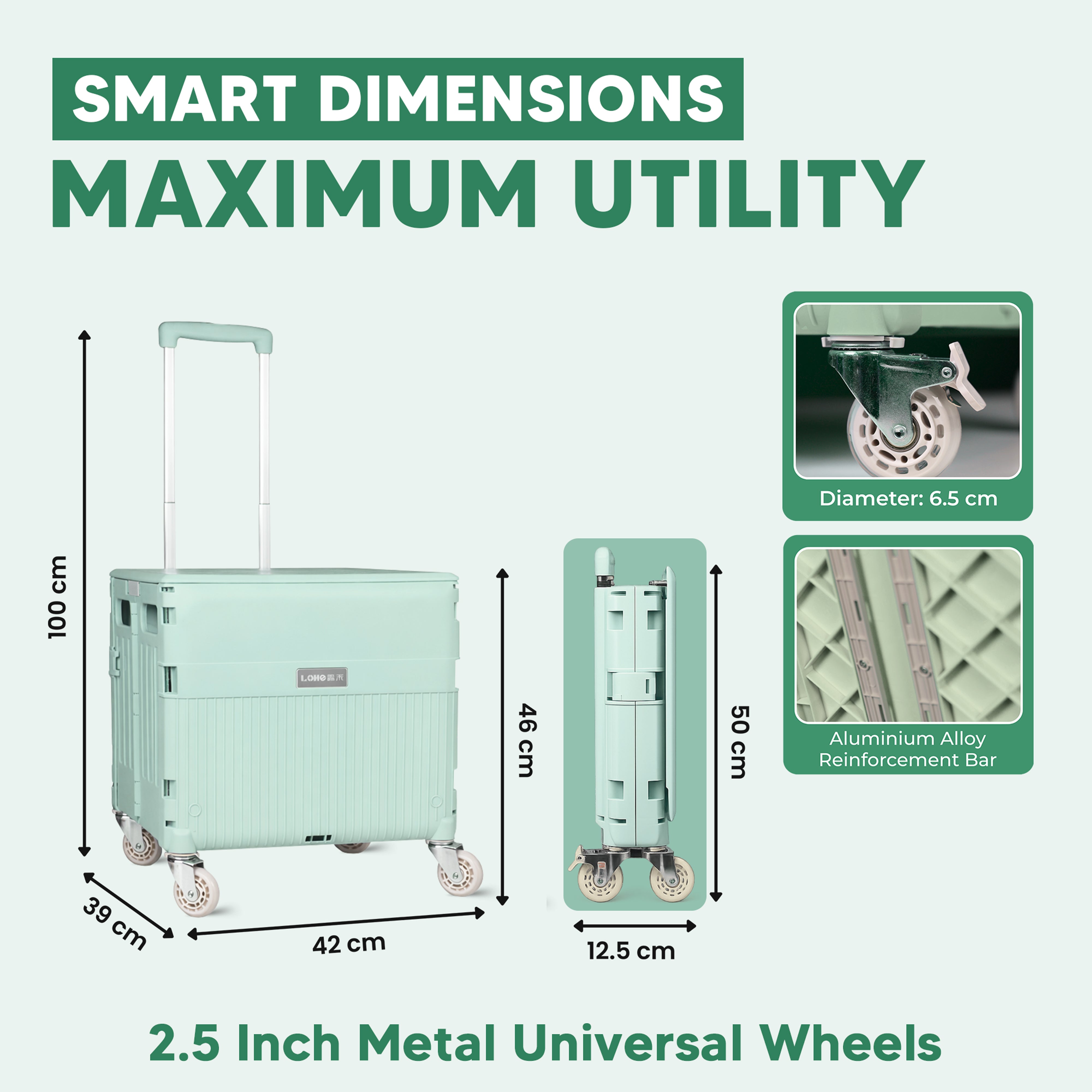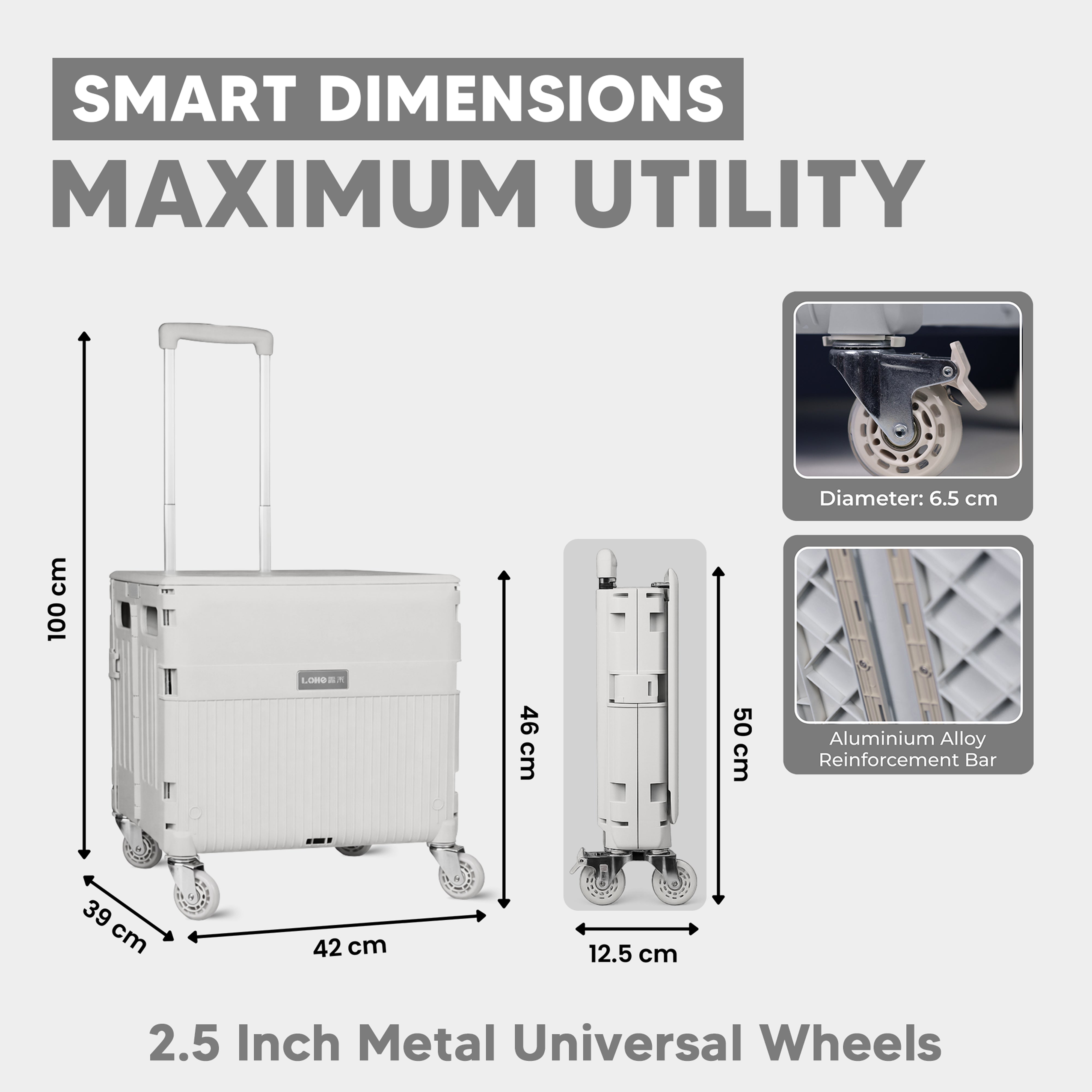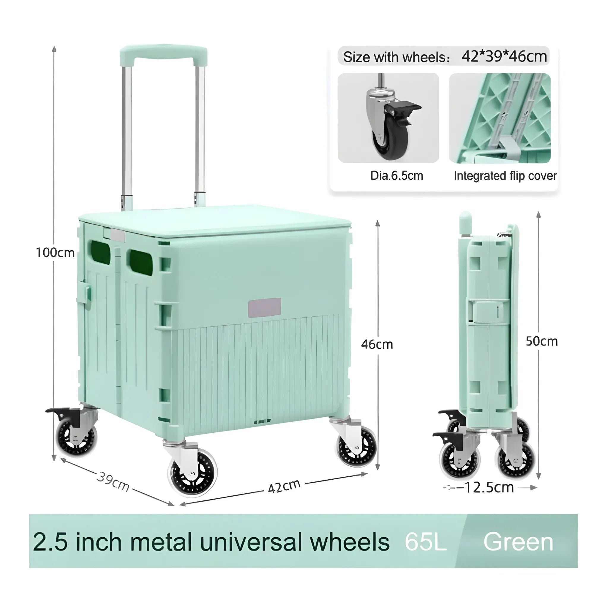 With a load capacity of up to 80–160 kg and a spacious 65L capacity, this cart easily handles groceries, luggage, and heavy items. When not in use, it folds down to a compact size for easy storage in your car trunk, behind doors, or under storage spaces.
