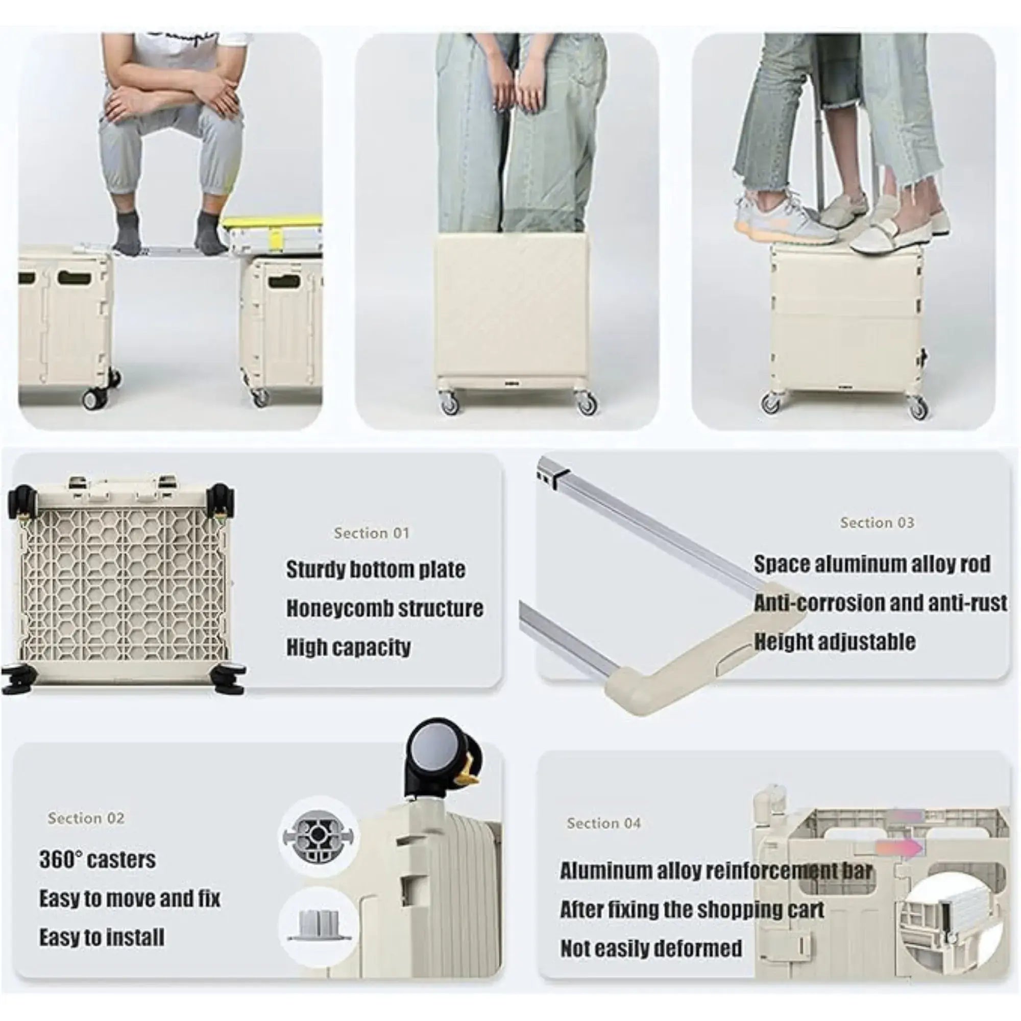 Perfect for grocery shopping, travel, luggage transport, portable storage, seating, and even as a stepping tool. This versatile trolley adapts to your daily needs at home or on the go.